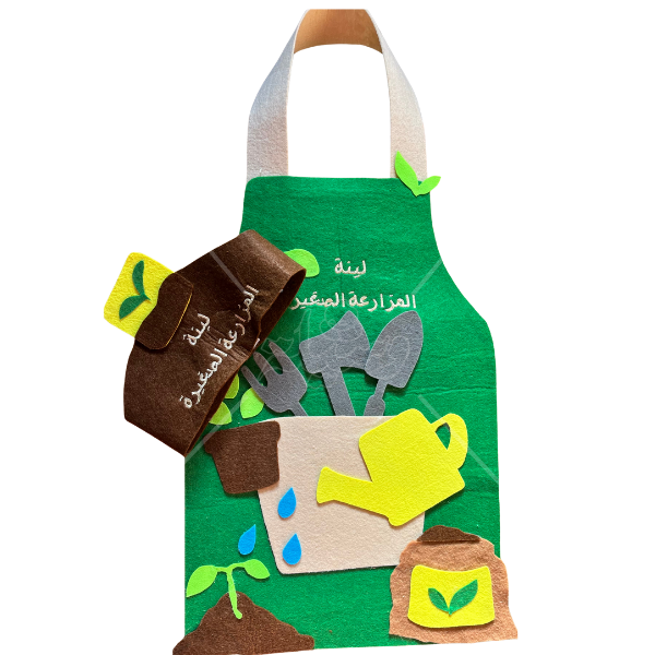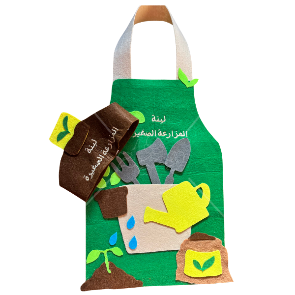 تصميم تفاعلي وجذاب: المريول ليس مجرد لباس، بل هو لوحة تعليمية تضم عناصر الزراعة الأساسية (المرش، أدوات الحفر، الأشتال، وقطرات الماء) المصنوعة من اللباد الملون بأسلوب بارز (3D) يجذب حواس الطفل.