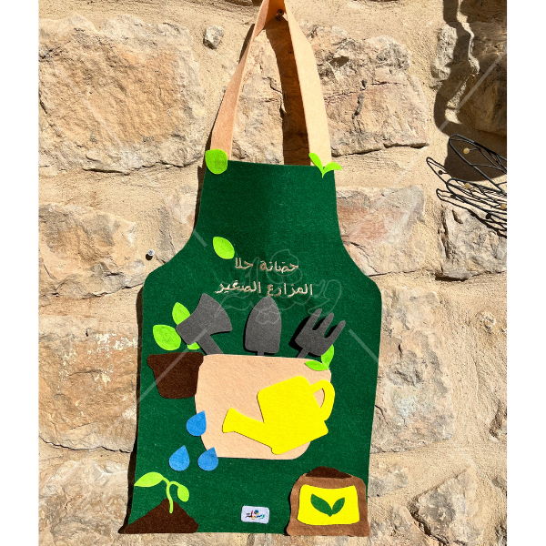 تصميم تفاعلي وجذاب: المريول ليس مجرد لباس، بل هو لوحة تعليمية تضم عناصر الزراعة الأساسية (المرش، أدوات الحفر، الأشتال، وقطرات الماء) المصنوعة من اللباد الملون بأسلوب بارز (3D) يجذب حواس الطفل.